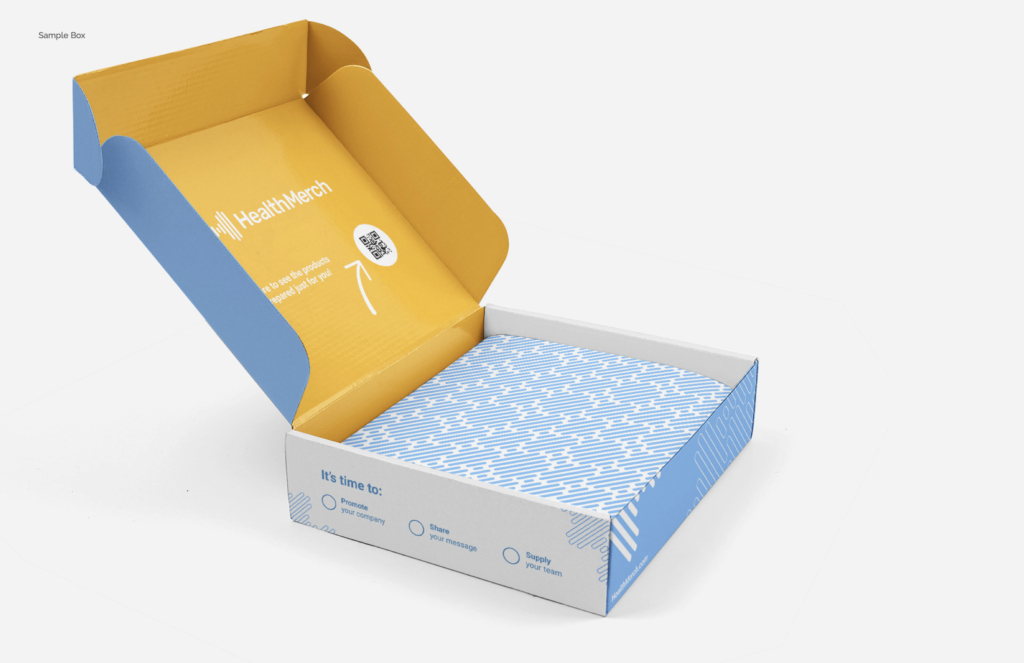 Get inspired with the HealthMerch product sample kit box with custom designs throughout.
